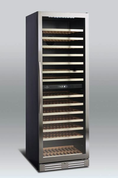 Компактный холодильный шкаф с одной дверью вмещает в себя 154 бутылкки вина, которые размещаются на 7+6 деревянных полках и в нижнем отсеке.