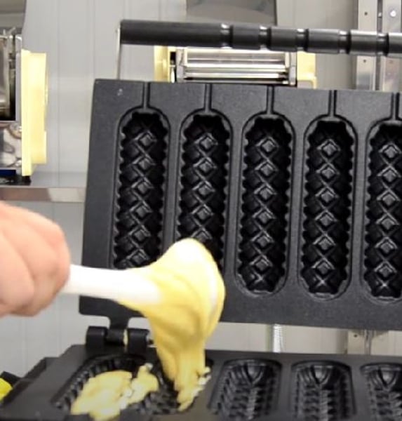 Тесто в этом аппарате идентично к рецептуре теста для бельгийских вафель. В конце приготовления получается сосиска, запеченная в мягком вафельном тесте, но при желании можно использовать различные начинки - сыр, бекон, запекать сосиски в вафле.