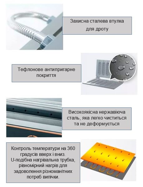 Нагрев осуществляется одновременно снизу и сверху. Корпус выполнен из восококачественной нержавеющей стали, пресс-формы чугунные с антипригарным покрытием. Размер рабочей поверности - 295х185 мм. Аппарат не требует специальной вытяжки, так как изделие выпекается, а не жарится.