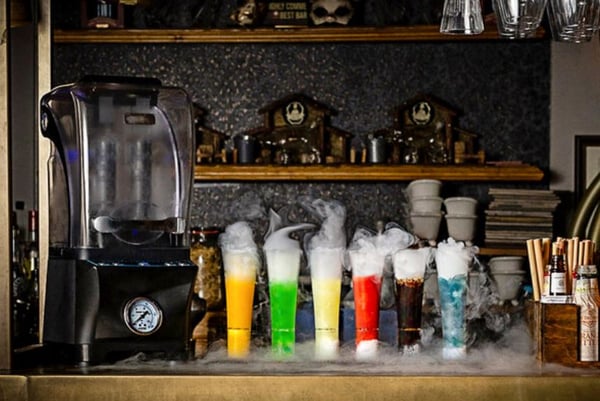 Машина превращает Co2 в сухой лед и создает дымящиеся пузырные напитки, эффект которых длится до 25 минут, а дымящие - до 5 минут.