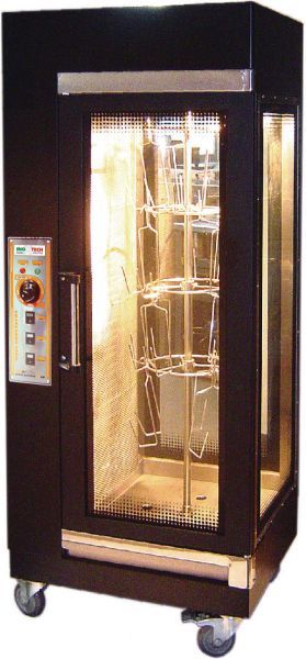 Нагревательные элементы расположены по бокам,а вращение вертела обеспечивает равномерное прожаривание кур и образование золотистой корочки.