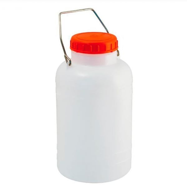Бидон цилиндрической формы белого цвета выполнен из полиэтилена высокой плотности HDPE, красная крышка из PP полипропилена с прокладкой, подходит для контакта с пищевыми продуктами . Оборудована емкость ручкой из оцинкованной стали.