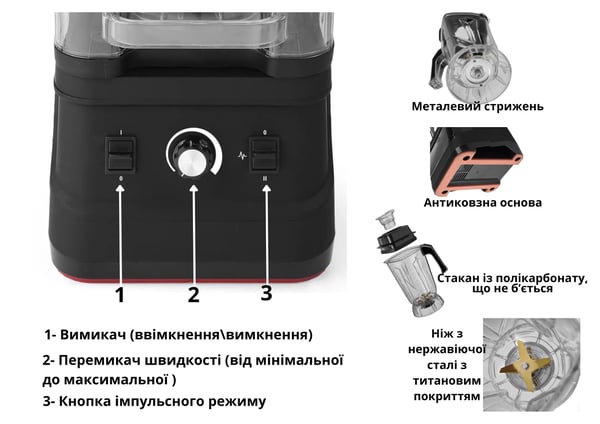 Блендер оснащен колпаком из поликарбоната, что способствует подавлению шума и работает только при полностью закрытой крышке.