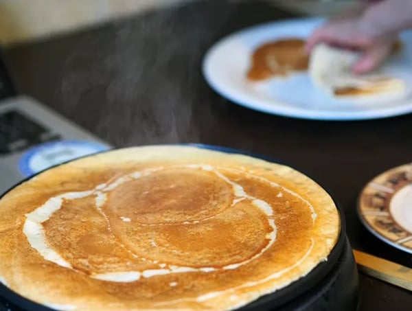 За счет быстрого нагрева блинчик пропекается за одну-две минуты.