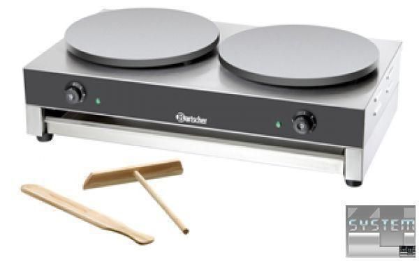 Предназначена для жарки блинов непосредственно на рабочей поверхности. 2 рабочие поверхности. Рабочие поверхности выполнены из чугуна со специальным покрытием, которое позволяет жарить с минимальным количеством жира. Корпус из нержавеющей стали. Комплектуется деревянной палочкой для распределения теста по поверхности и резак. Терморегулятор позволяет устанавливать температуру от 0 до 300 С.