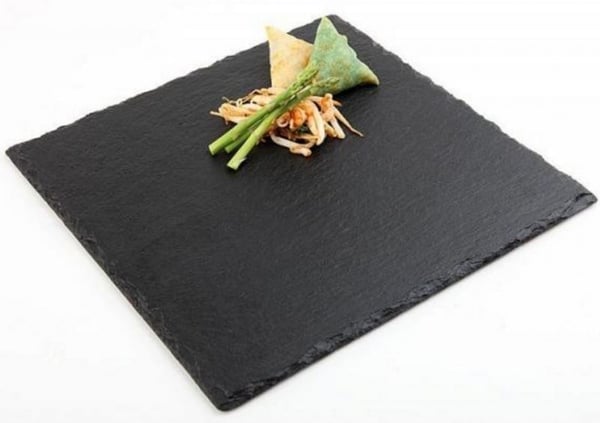 Сланцевое блюдо нуждается в правильном уходе: мыть вручную и в периодической смазке маслом поверхности квадратной тарелки Hendi 424919.
