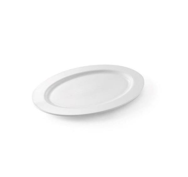 Блюдо выполнено из фарфора, белого цвета. Имеет овальную форму.