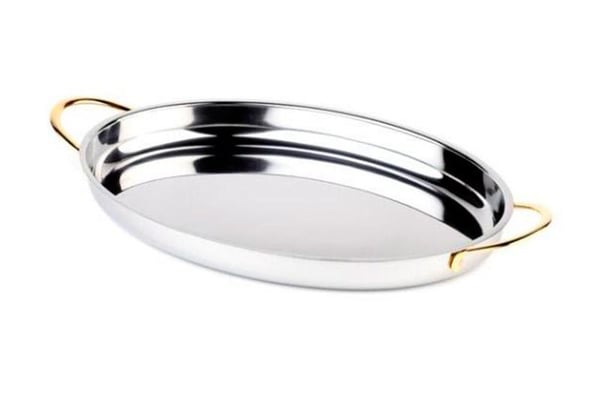 Блюдо для подачи нарезки с золотыми ручками изготовлено из высококачественной пищевой нержавеющей стали 18/10, которой храрактерна устойчивость к процессам коррозии, имеет глянцевую поверхность с гладкой каймой.