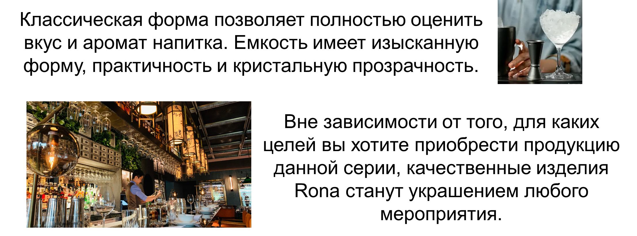 Rona – это всемирно признанный производитель профессиональной стеклянной посуды из Словакии, известный своим высоким качеством и безупречной репутацией. Коллекции барного стекла от этого европейского бренда отличаются изяществом, разнообразием декоров и форм, а также высоким качеством ручной работы. Компания RONA имеет сертификат ISO 9001, подтверждающий высокое качество продукции по европейским стандартам.