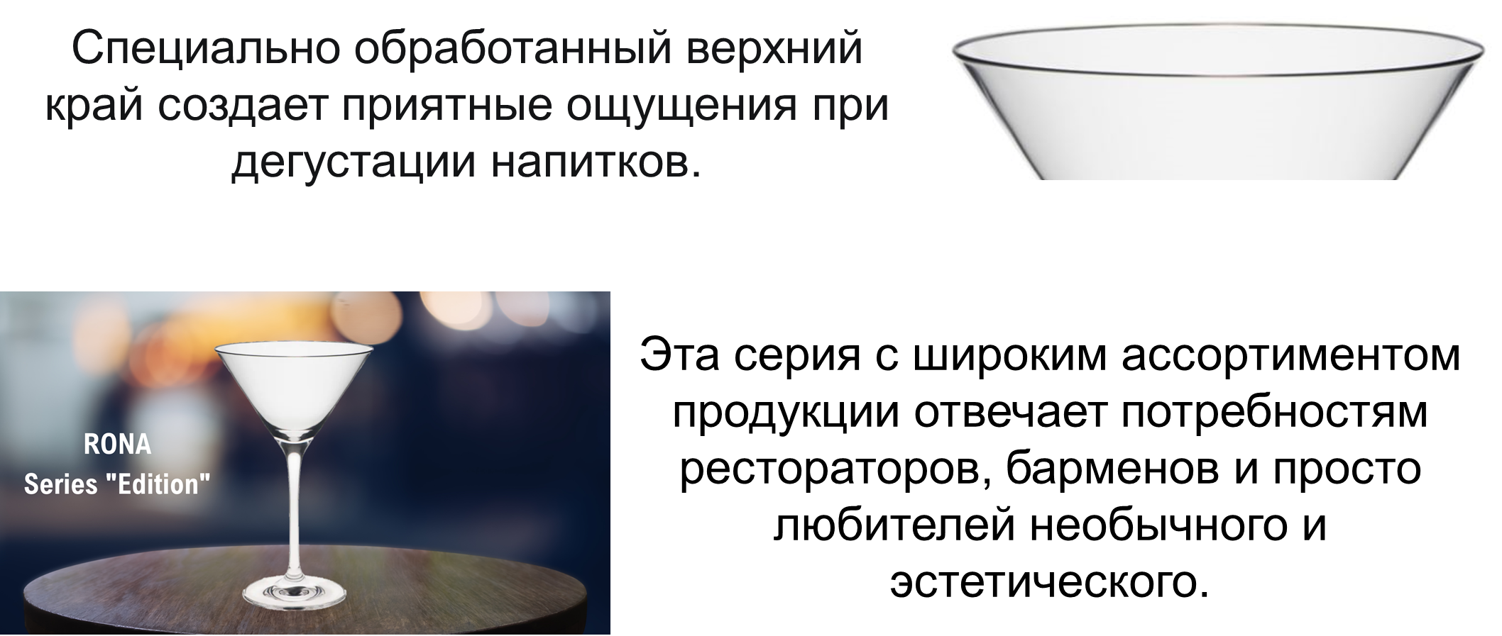 Коллекция “Edition" – воплощение элегантности и качества. Легкая цельная конструкция отличается необычайной стойкостью к сколам благодаря лазерной обработке края. Бокал для коктейлей – идеальное решение для элегантной подачи игристых вин, а также для новой интерпретации самых гламурных и модных коктейлей. Бокалы из коллекции EDITION – это воплощение прочности и стиля. Коллекция отражает все лучшие качества профессиональной стеклянной посуды RONA, сочетая удобство в использовании с эстетичной привлекательностью.