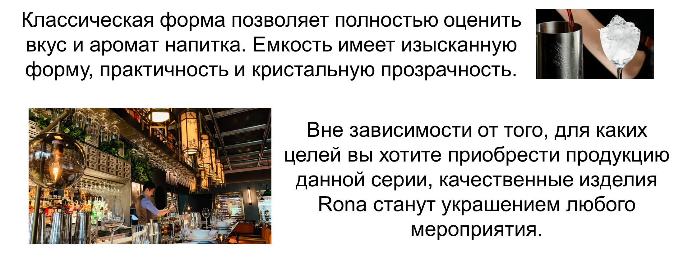 Rona – это всемирно признанный производитель профессиональной стеклянной посуды из Словакии, известный своим высоким качеством и безупречной репутацией. Коллекции барного стекла от этого европейского бренда отличаются изяществом, разнообразием декоров и форм, а также высоким качеством ручной работы. Компания RONA имеет сертификат ISO 9001, подтверждающий высокое качество продукции по европейским стандартам.