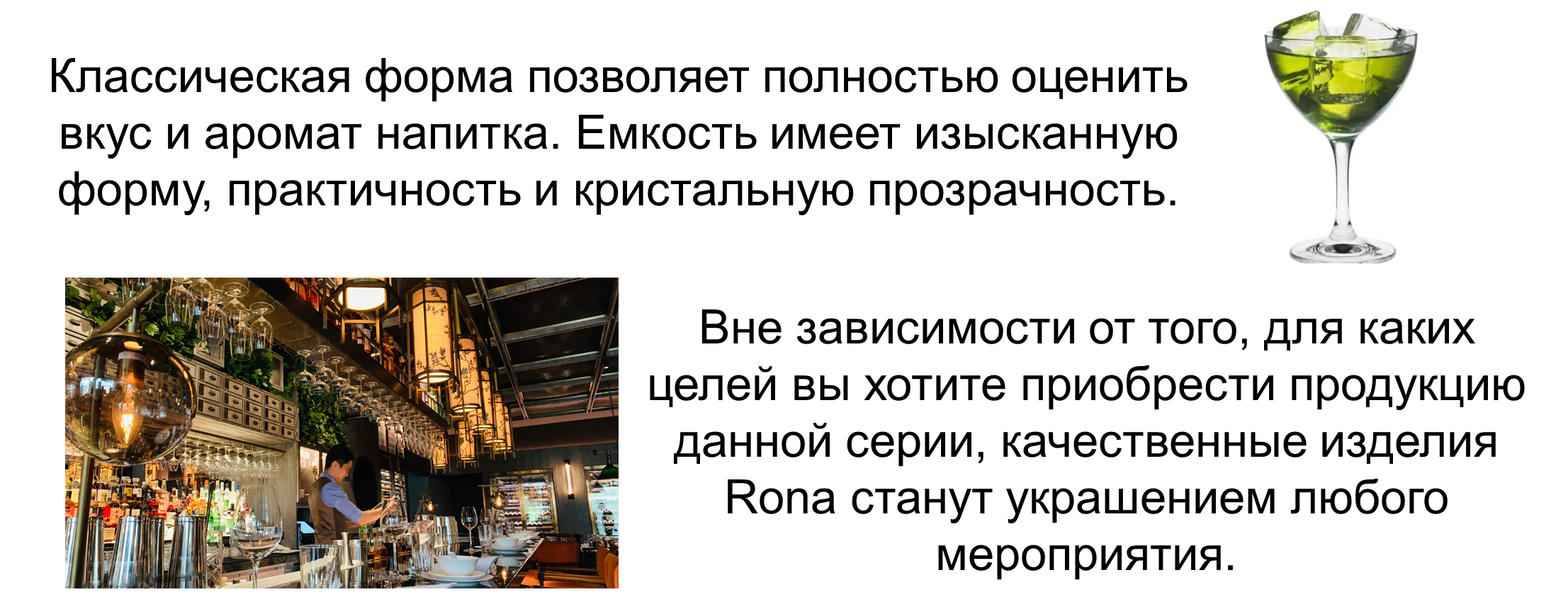 Rona – это всемирно признанный производитель профессиональной стеклянной посуды из Словакии, известный своим высоким качеством и безупречной репутацией. Коллекции барного стекла от этого европейского бренда отличаются изяществом, разнообразием декоров и форм, а также высоким качеством ручной работы. Компания RONA имеет сертификат ISO 9001, подтверждающий высокое качество продукции по европейским стандартам.