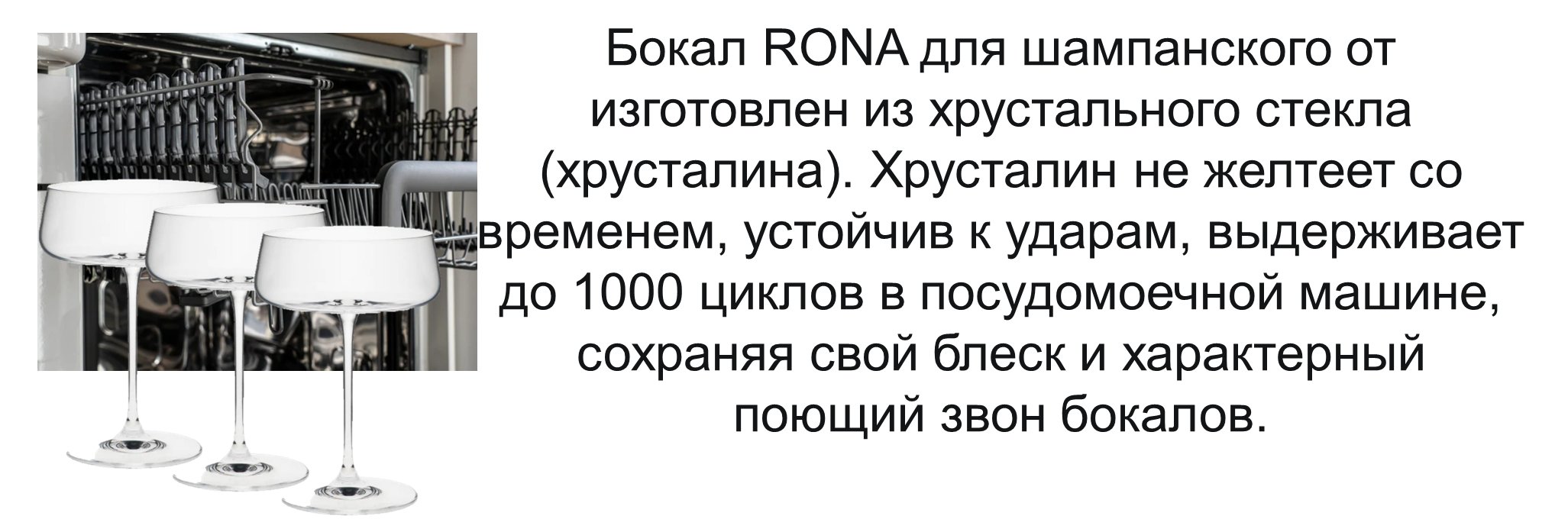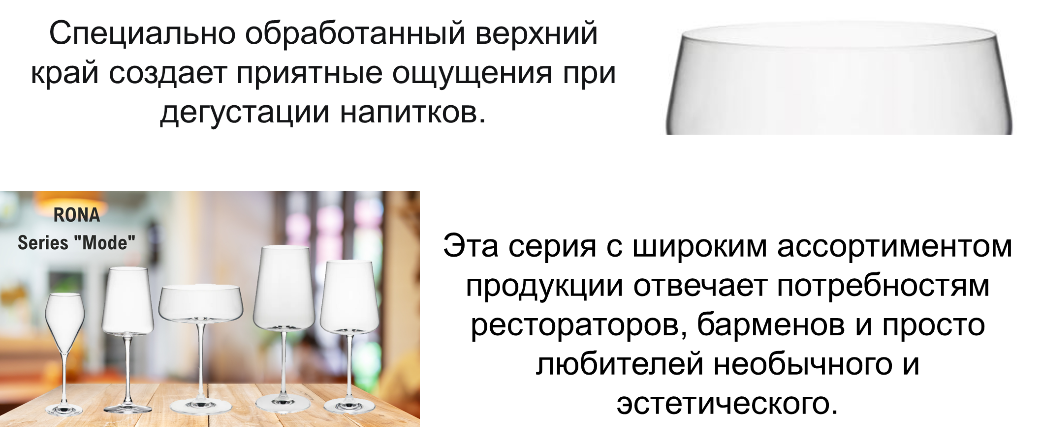 Коллекция “Mode" – воплощение элегантности и качества. Легкая цельная конструкция отличается необычайной стойкостью к сколам благодаря лазерной обработке края. Бокал для коктейлей – идеальное решение для элегантной подачи игристых вин, а также для новой интерпретации самых гламурных и модных коктейлей. Бокалы из коллекции Mode – это воплощение прочности и стиля. Коллекция отражает все лучшие качества профессиональной стеклянной посуды RONA, сочетая удобство в использовании с эстетичной привлекательностью.