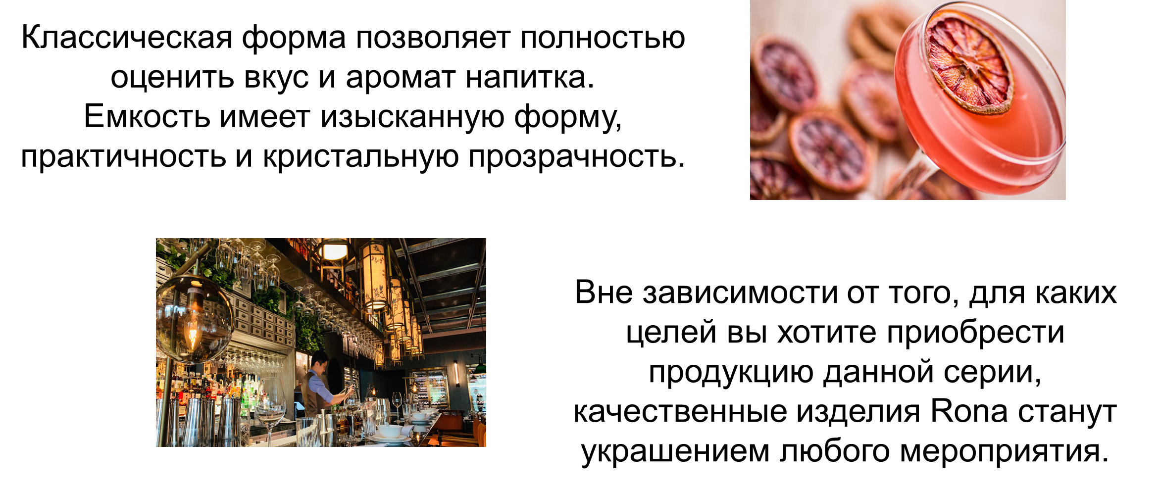 Rona – это всемирно признанный производитель профессиональной стеклянной посуды из Словакии, известный своим высоким качеством и безупречной репутацией. Коллекции барного стекла от этого европейского бренда отличаются изяществом, разнообразием декоров и форм, а также высоким качеством ручной работы. Компания RONA имеет сертификат ISO 9001, подтверждающий высокое качество продукции по европейским стандартам.