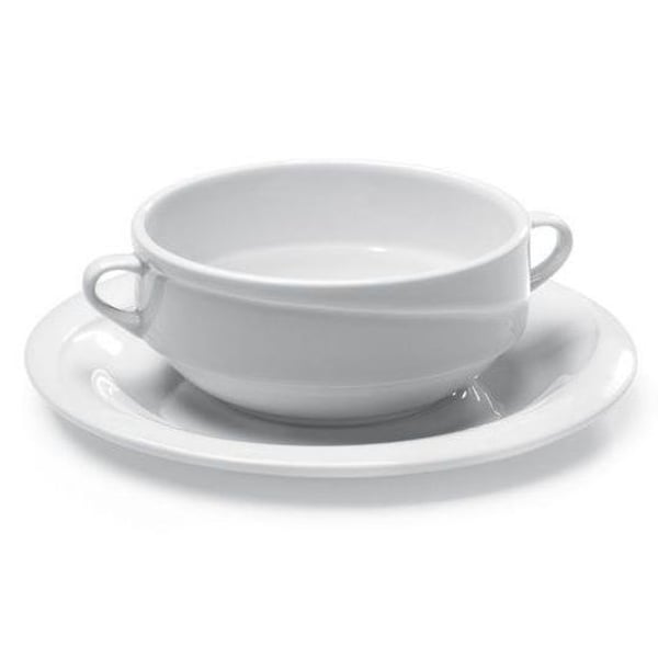 Чаша для супа изготовлен из ударопрочного белого фарфора, имеет круглую форму с ручками по бокам.