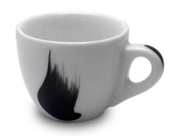 Изящная чашка в оригинальном стиле выполнена из очень крепкого, устойчивого к износу и высоким температурам фарфора белого цвета с оригинальным черным мазком кисти по кругу чашки.