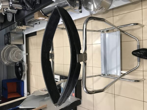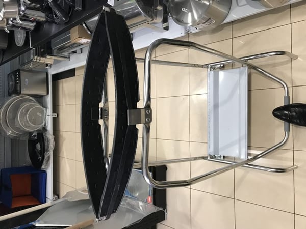 Два колеса с тормозами, на держателе пакетов, помогает перемещать приспособление по территории кухни. Отвечает санитарным и гигиеническим нормам.