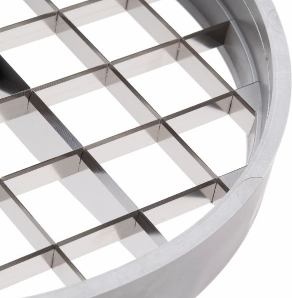Комплект диска-решётки и диска-слайсера подойдет для нарезки кубиков 25x25x25 мм перца, кабачков, лука, картофеля, дынь, яблок, ананасов для приготовления салатов, первых и вторых блюд. Можно комбинировать с другими режущими дисками для нарезки кубиков нестандартного размера. Помещается в рабочую камеру профессиональной овощерезки на вал двигателя. После использования легко снимается для очистки без использования инструментов. Для очистки, диск нужно поместить диск под струю холодной воды. Диск изготовлен из алюминия, режущие ножи - нержавеющая сталь.