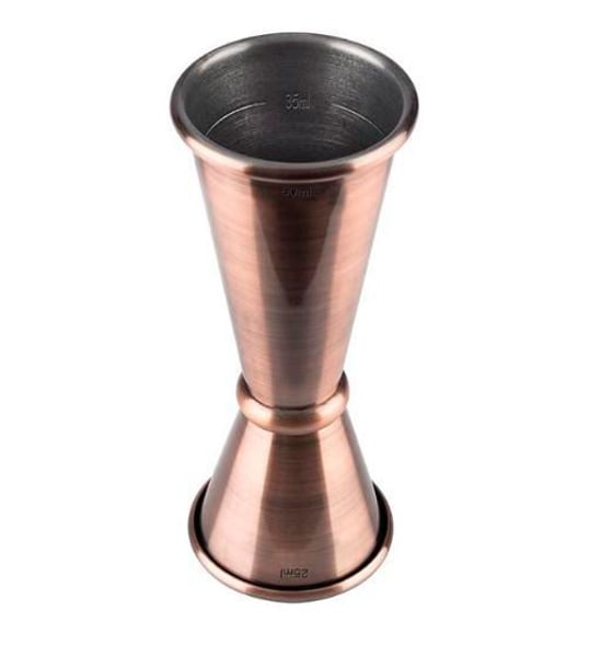 Барный джиггер изготовлен из нержавеющей стали 18/10 медного цвета, он состоит из двух стаканчиков в виде конуса, они разные по объему и выглядят, как песочные часы.