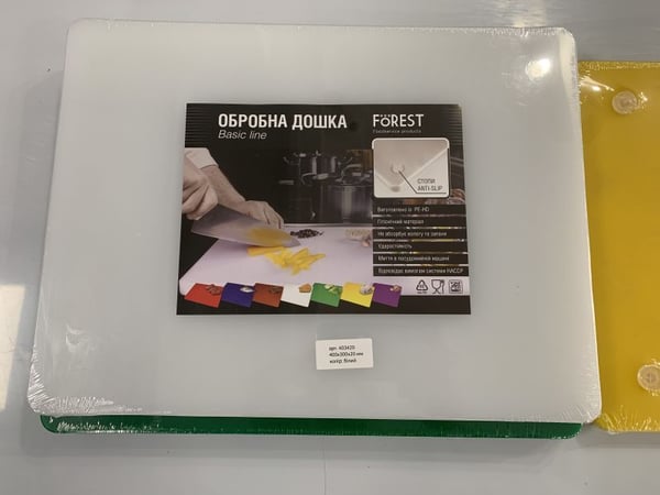 Дошка обробна серії Basic line застосовується на професійних кухнях в ресторанах, кафетеріях, пабах, піцеріях та інших закладах сектора HoReCa. Кухонна дошка Форест виготовлена з пластмаси PE-HD. Це фізіологічно нешкідливий матеріал, придатний до контакту з продуктами харчування.