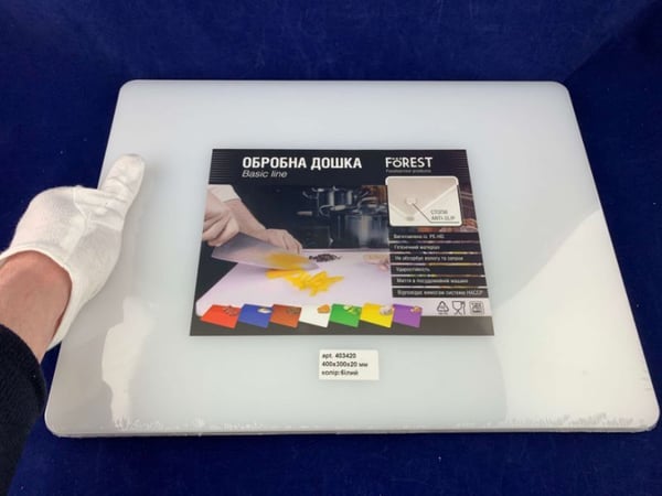 Пластикова дошка виконана в стандартному розмірі 400х300х20 білого кольору. Відповідає вимогам системи НАССР.