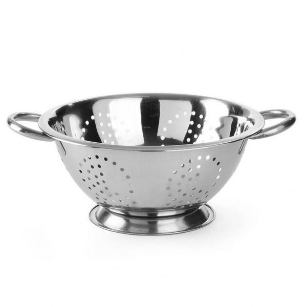 Дуршлаг перфорированный, для процеживания, выполнен из нержавеющей стали. По бокам расположены ручки. Нижняя часть имеет подставку.