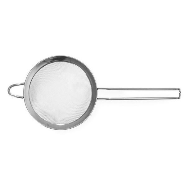 Дуршлаг с мелкой сеткой, имеет прочную конструкцию с широкой окантовкой. Ручка изогнута. Материал - нержавеющая сталь.