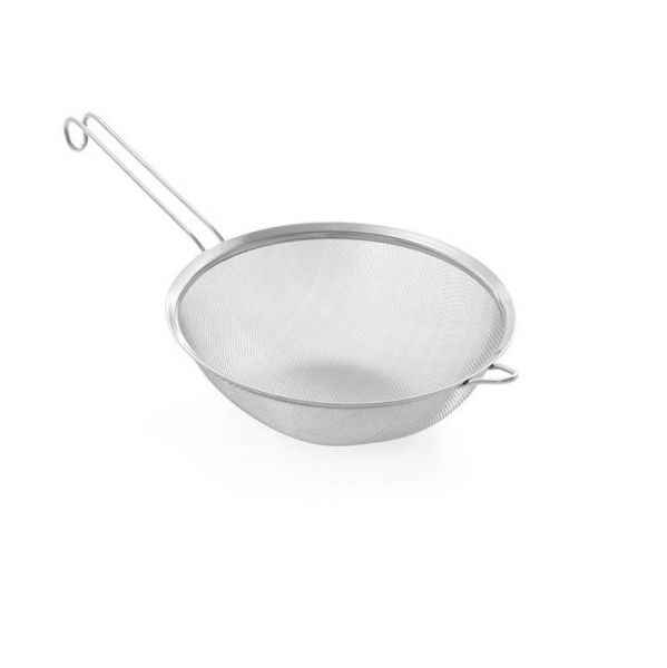 Дуршлаг с мелкой сеткой, имеет прочную конструкцию с широкой окантовкой. Ручка изогнута. Материал - нержавеющая сталь.