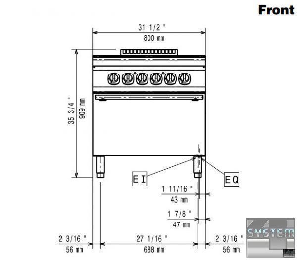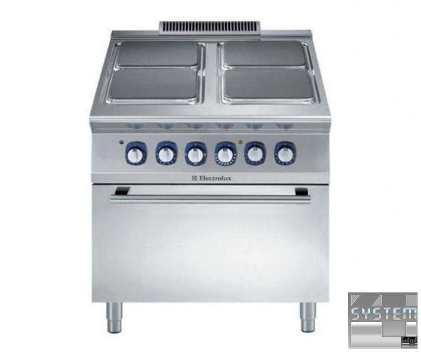 Электрическая плита с духовкой Electrolux e9eceh4qe0 включает 4 квадратные конфорки 300х300мм и мощностью по 4кВт. Плита имеет габаритные размеры: 800мм (длина), 930мм (глубина), 850мм (высота) и весит 140кг. Устройство питается от трехфазной сети с напряжением 400В и частотой 50 Гц. Электрическая духовка на 3 уровня под GN2/1, размером 540х650х300 мм, температурный режим работы 140...300°С, толщина металла рабочей поверхности 2 мм, в комплекте 1 решетка GN 2/1, нерж. сталь AISI 304.