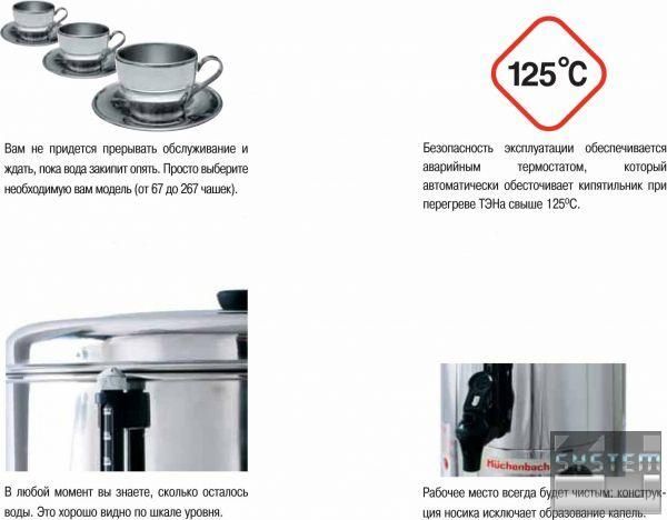 Наливные кипятильники обеспечивают получение от 67 до 260 порций высококачественных, горячих напитков.