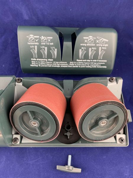 Корпус станка для заточки ножей выполнен из качественного пластика, есть кнопка включения и удобная ручка для удержания станка в неподвижном состоянии. Удобная замена дисков.
