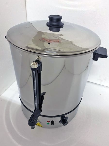 Оснащен сливным краном, термоизолированными ручками, индикатором уровня воды,