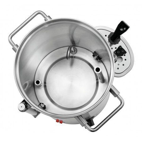 Внутренняя гладкая поверхность электрокипятильника позволяет свести до минимума образование накипи, оснащен термостатом от 30 до 95°C, съемным поддоном в высоту 145 мм, конденсационной пластиной под крышкой и ручками на петлях .