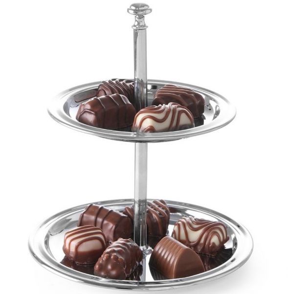 Этажерка для пирожных, выполнена из нержавеющей стали, разборная. Две секции диаметрами 130 и 110 мм.