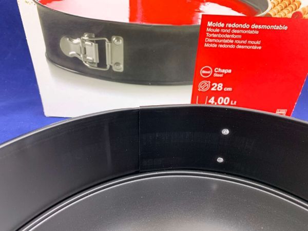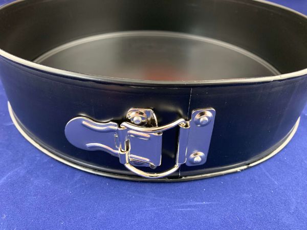 Дно и борта формы с двойным антипригарным покрытием и гладкой матовой поверхностью черного цвета. Изделие оснащено простой и надежной защелкой, с помощью которой, кольцо плотно фиксируется вокруг основы.