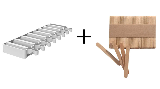 Продается в комплекте, который включает в себя 2 формочки (по 75 мл), поднос и 50 пищевых деревянных палочек.