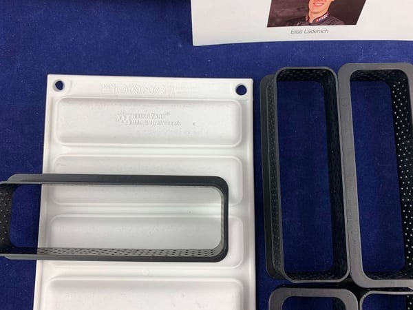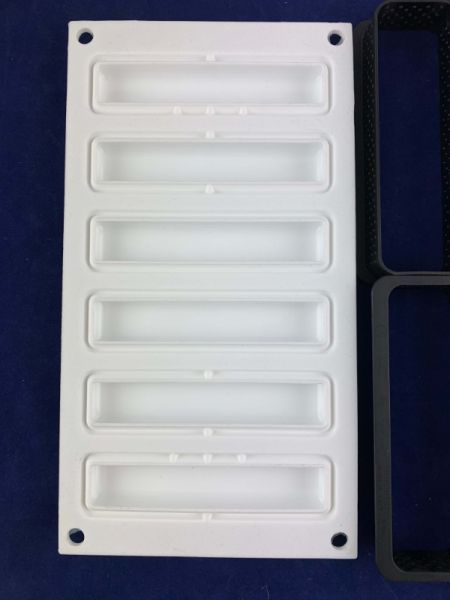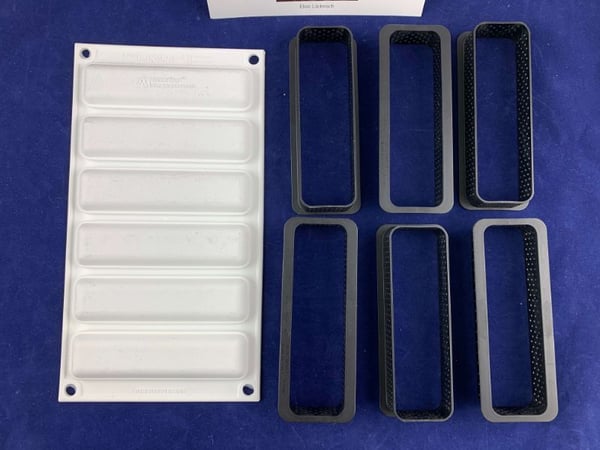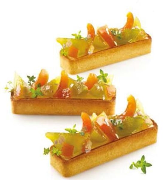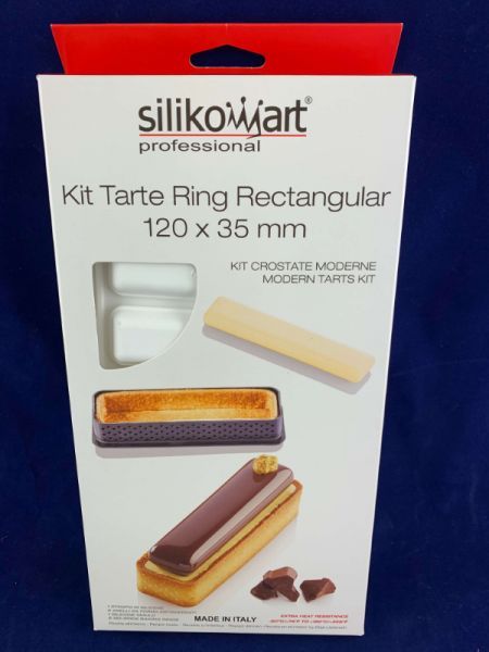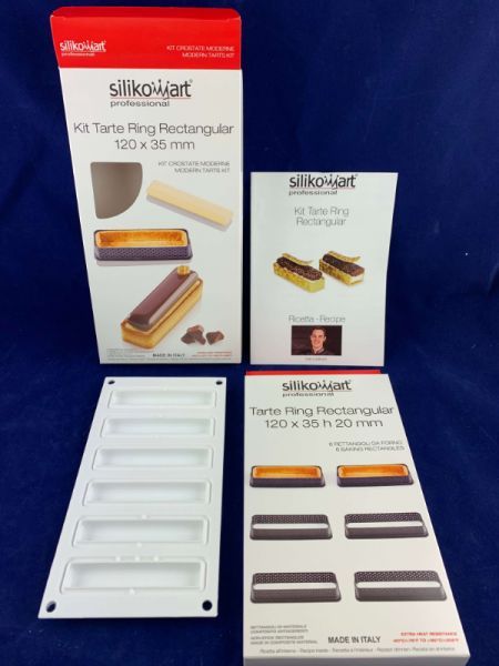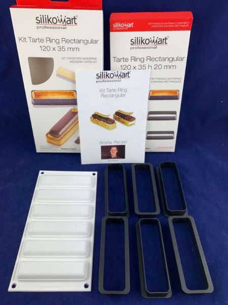 Комплект состоит из шести прямоугольных форм размером 120x35h20мм изготовленных из недеформируемого композитного термопластичного материала, пригодных для использования в печи для реализации основы, что позволяет положить мусс или крем на песочное тесто.