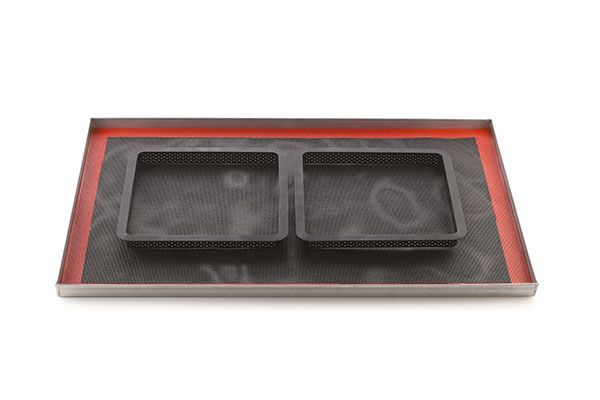 Комплект состоит из одной квадратной формы размером 200х200х20 мм, изготовленной из недеформируемого композитного термопластичного материала, пригодной для использования в печи для реализации основы, что позволяет положить мусс или крем на песочное тесто.