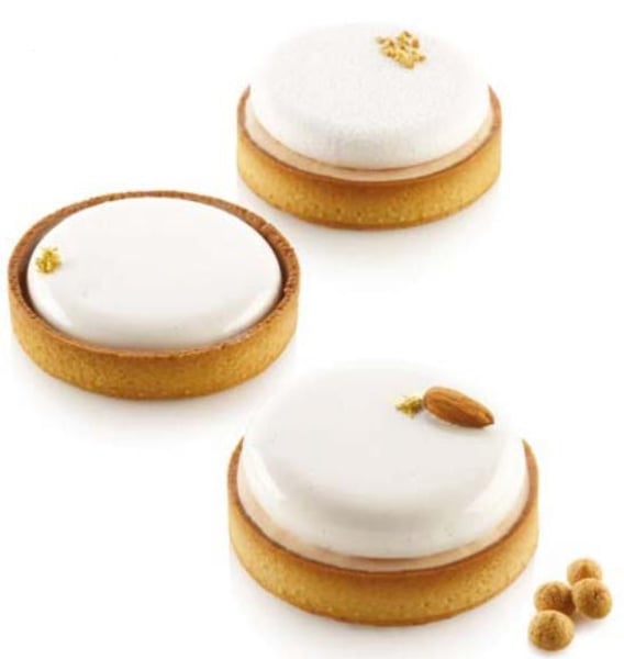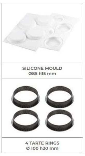 Комплект состоит из двух элементов: 4 кольца диаметром 100 мм, изготовленных из недеформируемого композитного термопластичного материала, пригодного для использования в печи для реализации основы, и силиконовой формы, состоящей из четырех полостей Ø 85 х 15 мм каждое, что позволяет сделать мусс или крем, чтобы положить на песочное тесто. Кольца антипригарные, нержавеющие, допускают однородное приготовление и обладают высокой термостойкостью.