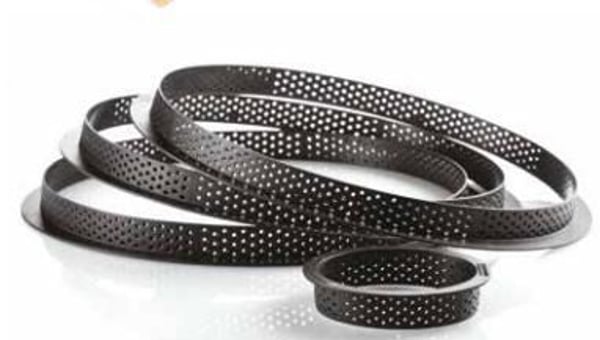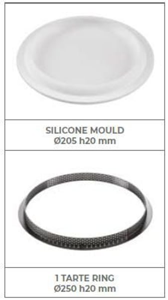 Комплект состоит из двух элементов: одно кольца диаметром 250 мм, изготовленного из недеформируемого композитного термопластичного материала, пригодного для использования в печи для реализации основы, и силиконовой формы, состоящей из одной полости Ø205 х 20 мм, которое позволяет сделать мусс или крем, чтобы положить на песочное тесто. Кольца антипригарные, нержавеющие, допускают однородное приготовление и обладают высокой термостойкостью.