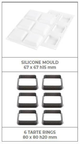 Комплект состоит из двух элементов: 6 квадратов размером 80x80h20мм, изготовленных из недеформируемого композитного термопластичного материала, пригодного для использования в печи для реализации основы, и силиконовой формы, состоящей из шести углублений размером 67х67хh15мм каждое. Это позволяет сделать мусс или крем, чтобы положить на песочное тесто. Квадраты антипригарные, нержавеющие, допускают однородное приготовление и обладают высокой термостойкостью.