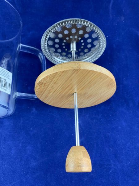 Изготовлен из боросиликатного стекла, благодаря чему имеет превосходную термостойкость и повышенную ударопрочность по сравнению с обычным стеклом, и дополнен элегантной бамбуковой крышкой. Материал устройства пресса – нержавеющая сталь.