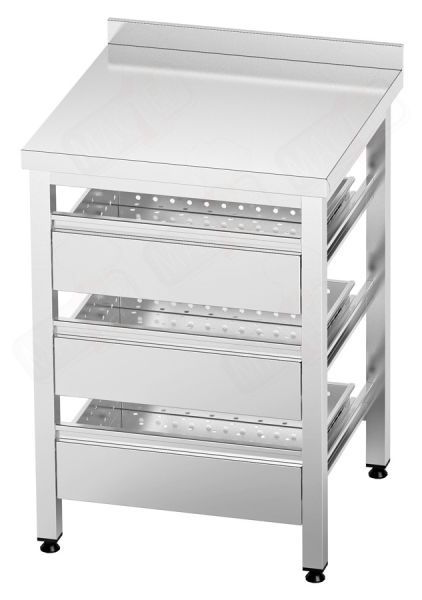 Подставка выполнена из высококачественной пищевой нержавеющей стали, видвижные ящики станции с перфорированным дном, регулируемые по высоте винт-опоры ног.