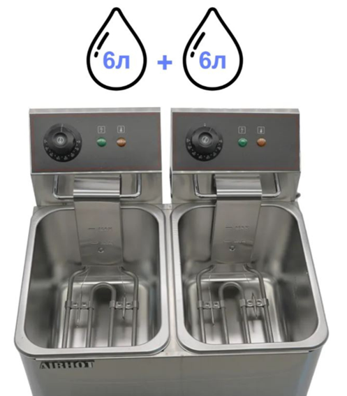 Фритюрница имеет 2 ванны объемом по 6 литров каждая.