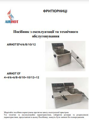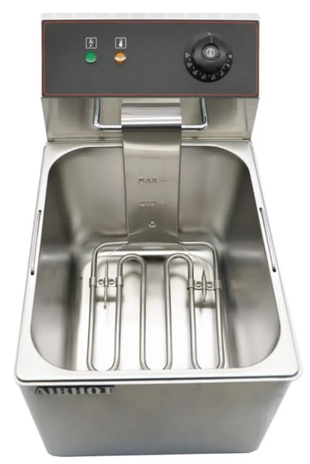 Фритюрниця Airhot EF 8 – це професійне кухонне обладнання, яке дозволяє обсмажувати різноманітні кулінарні вироби шляхом занурення їх у великий об'єм гарячої олії. В результаті приготування, страва набуває хрумкої золотистої скоринки, при цьому зберігає достатньо вологості і виходить особливий ароматний смак.