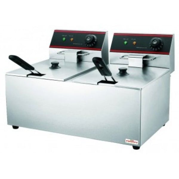 Настольная фритюрница изготовлена из нержавеющей стали, оснащена световыми индикаторами работы, но без крана для слива масла. Данная модель с двумя ваннами на 11 литров, состоит из емкостей, которые плотно накрываются крышкой, блока управления и съемными корзинами, рабочая температура масла от +50 до +190°C. Пассерование продуктов осуществляется в сетчатой корзине из стальной проволоки. Корзина имеет устойчивую к высоким температурам ручку и крючки, с помощью которых она подвешивается на скобу для стекания масла. Съемные емкости легко и быстро разбираются, что значительно облегчает уход за ними и позволяют без усилий проводить санитароную очистку после использования фритюрницы. Габариты корзины 245х265х140мм, напряжение 220В, мощность 3,50кВт.+3,50кВт.