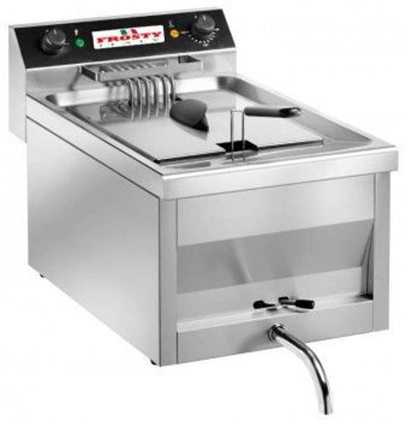 Настольная фритюрница изготовлена из нержавеющей стали, оснащена световыми индикаторами работы, с краном для слива масла. Данная модель с одной ванной на 12 литров, вместимость корзины составляет 2кг, состоит из емкости, которая плотно накрывается крышкой, блока управления и съемной корзины, рабочая температура масла от +60 до +200°C. Пассерование продуктов осуществляется в сетчатой корзине из стальной проволоки. Время для разогрева еды составляет 5 минут, а на приготовления уходит 4 минуты. Съемные емкости легко и быстро разбираются, что значительно облегчает уход за ними и позволяют без усилий проводить санитароную очистку после использования фритюрницы. Напряжение 380В, мощность 9,0кВт.