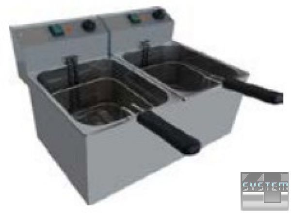 Недорогая электрическая фритюрница с двумя ваннами. Автоматически поддерживает заданный температурный режим. Модель без крана для слива масла. Легко разбирается и очищается. Приготовление картофеля занимает 3-4 минуты.
