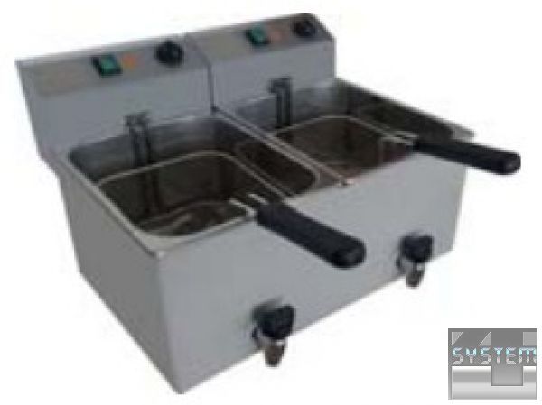 Недорогая электрическая фритюрница с двумя ваннами. Автоматически поддерживает заданный температурный режим. Модель без крана для слива масла. Легко разбирается и очищается. Приготовление картофеля занимает 3-4 минуты.
