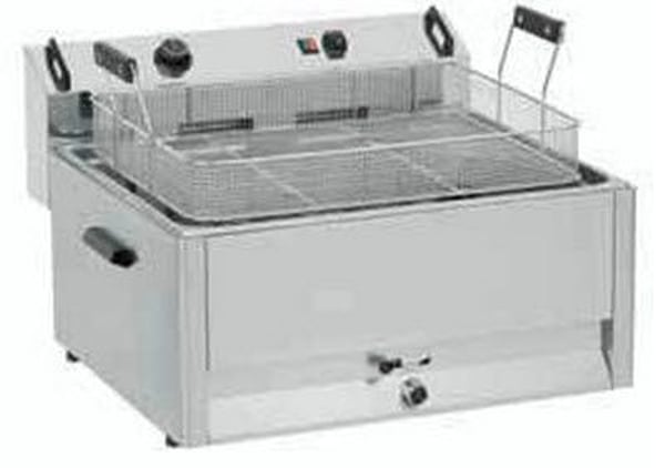 Модель оснащена специальными нагревательными элементами из нержавеющей стали, как и корпус оборудования. Надежный кран слива 3/4. Размеры корзины кухонного инвентаря составляет 130х235х100 мм. Внутренний контейнер для жира с сетчатой поверхностью.